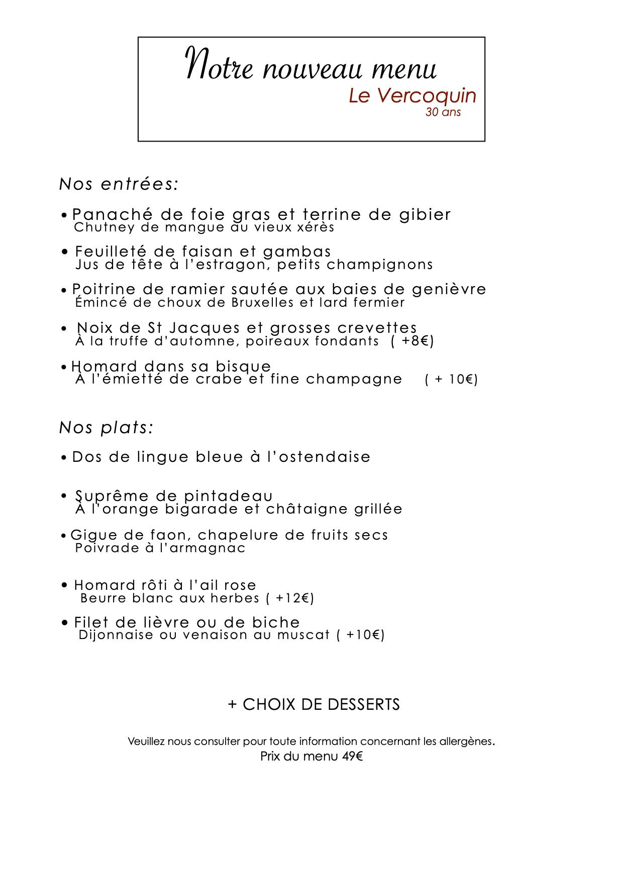 Plongez dans l’univers gourmand du Le Vercoquin et laissez-vous séduire par une carte riche et inspirée. Chaque plat met en lumière la finesse des produits régionaux et de saison, sublimés par le geste créatif de notre chef. Des entrées délicates aux plats signatures — gibier rôti, crustacés ou légumes de saison — chaque assiette raconte une histoire de goût, d’authenticité et de respect du produit.
